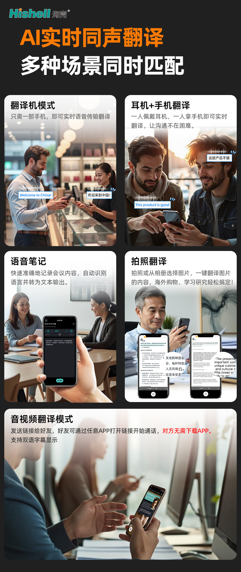 支持翻译机模式,无需复杂设备,仅需一部手机即可实现实时语音传输翻译,随手可用无负担。更贴心设计耳机+手机协同翻译,一人佩戴耳机、一人手持手机,双向实时翻译流畅衔接,日常对话、商务洽谈不再受语言阻碍。