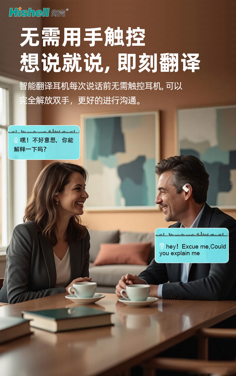 这款智能翻译耳机,以“无需手触、想说就说、即刻翻译”为核心,彻底打破沟通壁垒,让跨语言交流更轻松、更高效。它最大的亮点的是,每次说话前无需手动触控耳机,真正实现解放双手,让你在沟通时无需分心操作,专注于对话本身。