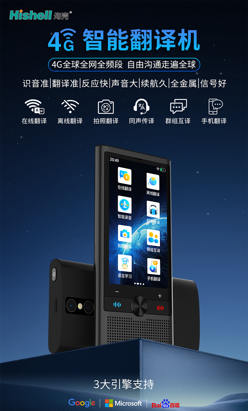 这款4G智能翻译机,搭载4G全球全网全频段技术,打破地域与信号限制,让你带着它走遍全球都能实现自由沟通,无需担心信号卡顿或频段不兼容的问题。机身采用全金属材质,质感出众且坚固耐用,兼顾颜值与实用性。