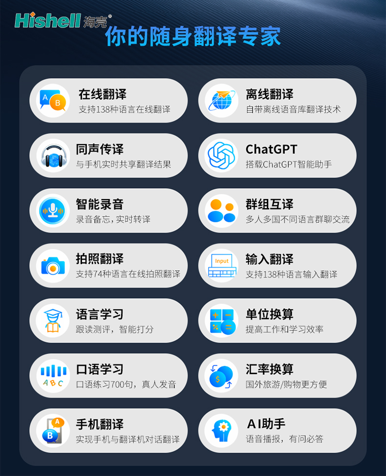 核心功能全面升级,搭载ChatGPT智能助力,翻译更精准、更贴合语境。支持同声传译,手机可实时共享翻译结果,会议、洽谈高效便捷;智能录音备忘实时转译,重要内容不遗漏。群组互译功能,让多人多国不同语言使用者,可轻松实现群聊交流,打破多语言沟通障碍。