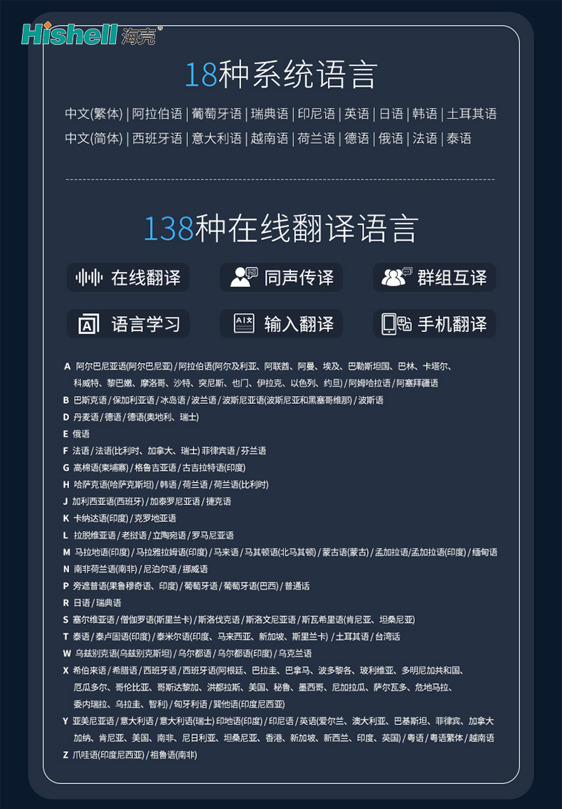 18种系统语言:中文(繁体)|阿拉伯语|葡萄牙语|瑞典语|印尼语|英语|日语|韩语|土耳其语中文(简体)|西班牙语|意大利语|越南语|荷兰语|德语|俄语|法语|泰语