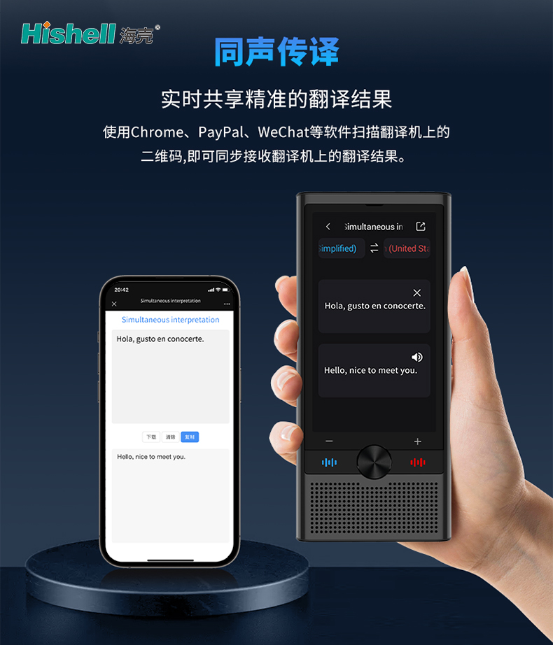 产品兼顾便捷性与实用性,支持多平台同步接收翻译结果。只需使用Chrome浏览器、PayPal、WeChat等常用软件,扫描翻译机机身的专属二维码,即可快速绑定设备,实时同步获取翻译内容,无需手动录入或二次转发,操作简单易懂,适配不同人群使用习惯。