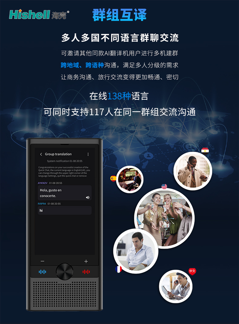 这款AI翻译机以群组互译为核心亮点,专为多人、多语种跨地域沟通设计,轻松打破语言壁垒,让不同国家、不同语言的使用者实现无障碍群聊交流。它支持邀请同款AI翻译机用户多机建群,无需额外操作,一键邀请即可组建专属沟通群组,适配各类多人互动场景。