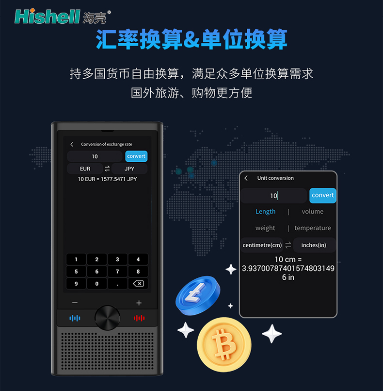 更贴心配备实用工具,单位换算提升工作学习效率,汇率换算让国外旅游、购物更省心;支持手机与翻译机对话翻译,AI助手语音播报、有问必答,小巧便携,随时随地满足你的翻译及各类实用需求,是你出行、学习、工作的必备伙伴。