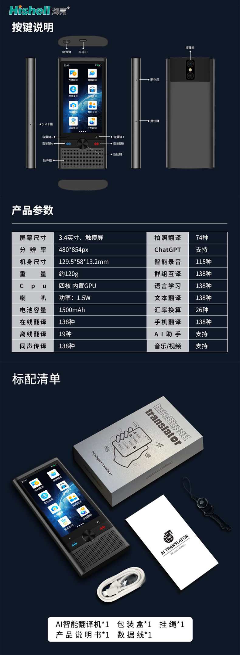 标配清单:AI智能翻译机*1,包装盒*1,挂绳*1,产品说明书*1,数据线*1