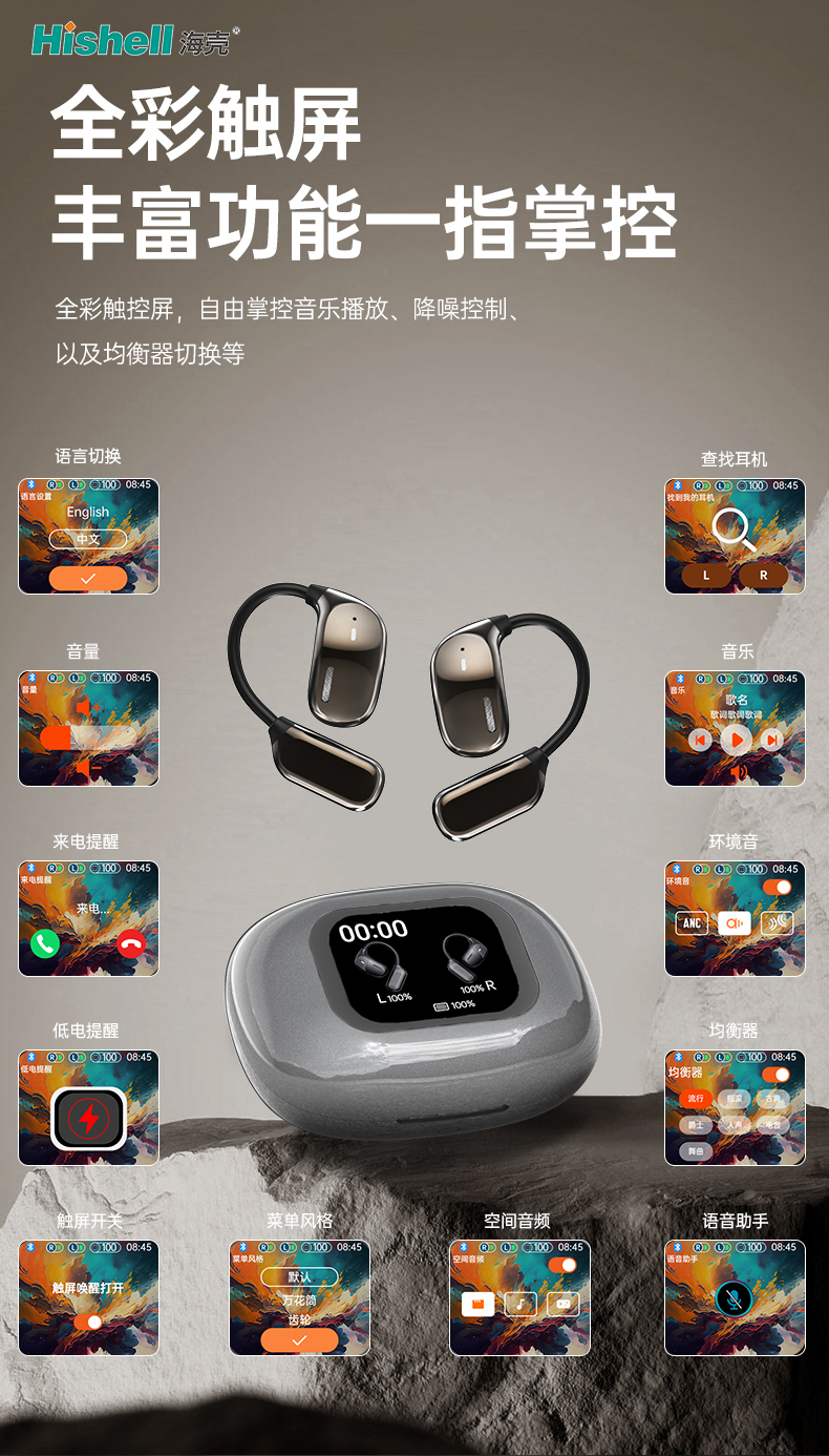 这款翻译耳机不仅是跨语言沟通利器,更以全彩触屏设计提升操作体验,丰富功能一指掌控,让使用更便捷。通过全彩触控屏,可轻松操作音乐播放、调节降噪模式,还能自由切换均衡器,根据喜好定制音质,娱乐体验更随心。