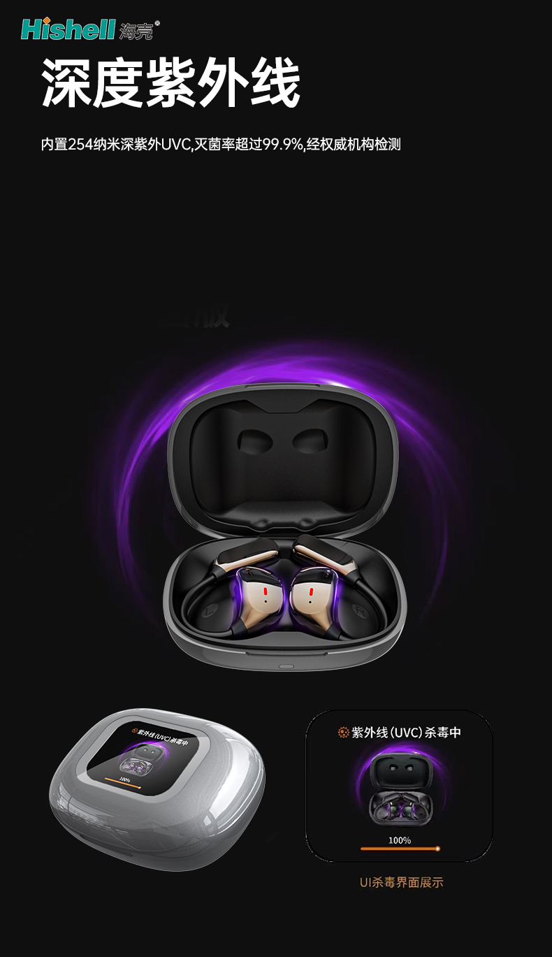 这款翻译耳机新增卫生防护优势,内置 254 纳米深紫外线 UVC,灭菌率超 99.9%,且经权威机构检测,使用后轻松杀灭耳机表面细菌,守护健康。
