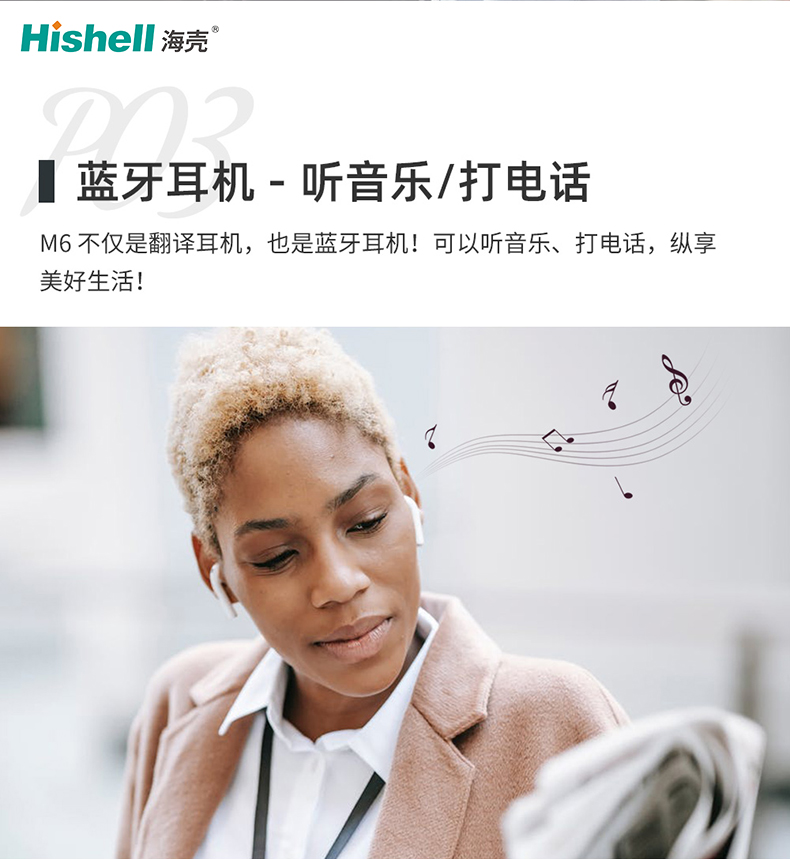 机身轻巧便携,佩戴舒适不压耳,续航持久,满足全天使用需求。M6不止是耳机,更是你生活中的沟通助手与娱乐伙伴,让听音乐、打电话、跨语言交流,都变得简单便捷,纵享自在美好生活。