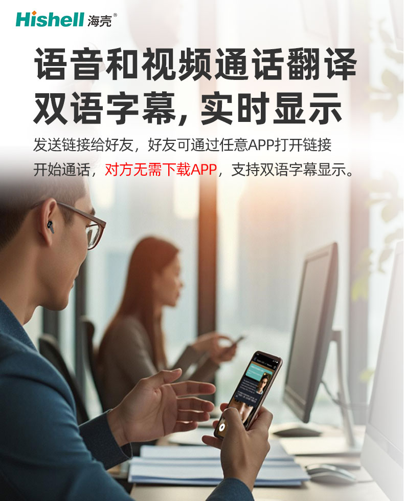 更贴心的是音视频翻译模式,发送链接给好友,对方无需下载任何APP,通过任意应用打开链接即可开启通话,同时支持双语字幕显示,清晰直观,跨国通话、远程交流更省心。小巧便携,功能强大,这款翻译耳机让跨语言沟通没有距离,满足多场景使用需求。