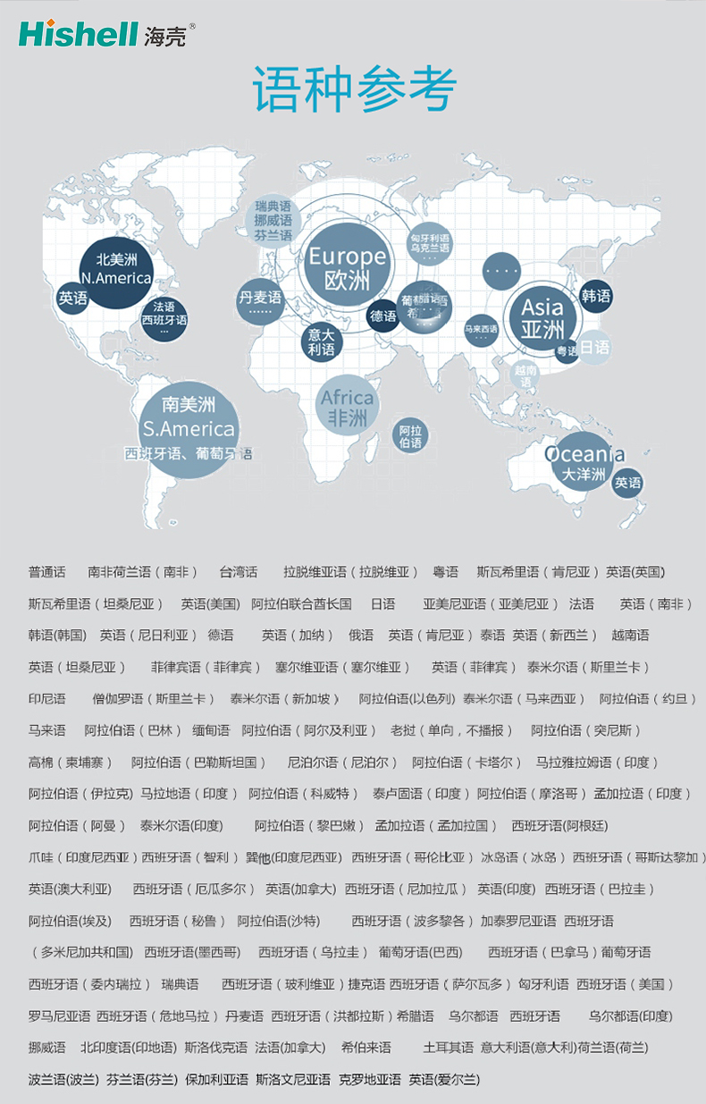 语种参考:普通话、南非荷兰语(南非)、台湾话、拉脱维亚语(拉脱维亚)、粤语、斯瓦希里语(肯尼亚)、英语(英国)、斯瓦希里语(坦桑尼亚)、英语(美国)、阿拉伯联合酋长国、日语、亚美尼亚语(亚美尼亚)、法语、英语(南非)、韩语(韩国)、英语(尼日利亚)、德语、英语(加纳)、 俄语、英语(肯尼亚)、泰语、英语(新西兰)、越南语、英语(坦桑尼亚)、菲律宾语(菲律宾)、塞尔维亚语(塞尔维亚)、英语(菲律宾)、泰米尔语(斯里兰卡)、印尼语、僧伽罗语(斯里兰卡)、泰米尔语(新加坡)、阿拉伯语(以色列)、泰米尔语(马来西亚)、阿拉伯语(约旦)、马来语、阿拉伯语(巴林)、缅甸语、阿拉伯语(阿尔及利亚)、老挝(单向,不播报)、阿拉伯语(突尼斯)、高棉(柬埔寨)、阿拉伯语(巴勒斯坦国)、尼泊尔语(尼泊尔)、阿拉伯语(卡塔尔)、马拉雅拉姆语(印度)、阿拉伯语(伊拉克)、马拉地语(印度)、阿拉伯语(科威特)、泰卢固语(印度)、阿拉伯语(摩洛哥)、孟加拉语(印度)、阿拉伯语(阿曼)、泰米尔语(印度)、阿拉伯语(黎巴嫩)、孟加拉语(孟加拉国)、西班牙语(阿根廷)、爪哇(印度尼西亚)、西班牙语(智利)、巽他(印度尼西亚)、西班牙语(哥伦比亚)、冰岛语(冰岛)、西班牙语(哥斯达黎加)、英语(澳大利亚)、西班牙语(厄瓜多尔)、英语(加拿大)、西班牙语(尼加拉瓜)、英语(印度)、西班牙语(巴拉圭)、阿拉伯语(埃及)、西班牙语(秘鲁)、阿拉伯语(沙特)、西班牙语(波多黎各)、加泰罗尼亚语、西班牙语(多米尼加共和国)、西班牙语(墨西哥)、西班牙语(乌拉圭)、葡萄牙语(巴西)、西班牙语(巴拿马)、葡萄牙语、西班牙语(委内瑞拉)、瑞典语、西班牙语(玻利维亚)、捷克语、西班牙语(萨尔瓦多)、匈牙利语、西班牙语(美国)、罗马尼亚语、 西班牙语(危地马拉)、丹麦语、西班牙语(洪都拉斯)、希腊语、乌尔都语、西班牙语、乌尔都语(印度)、挪威语 、北印度语(印地语)、斯洛伐克语、法语(加拿大)、希伯来语、土耳其语、 意大利语(意大利)、荷兰语(荷兰)、波兰语(波兰)、芬兰语(芬兰)、保加利亚语、斯洛文尼亚语、克罗地亚语、英语(爱尔兰)