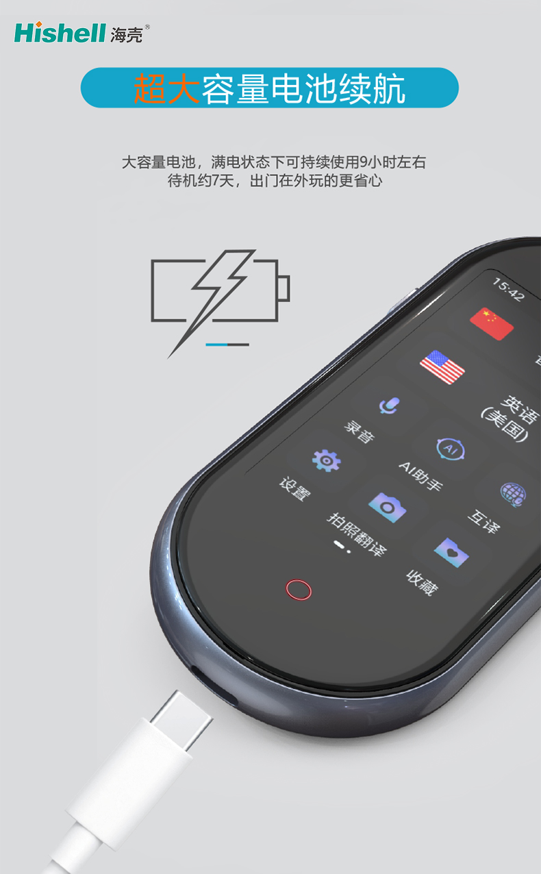 这款便携翻译机以超大容量电池为核心优势,彻底解决外出翻译的续航焦虑。内置高能量密度电池,满电状态下可持续进行翻译工作约9小时,无论是全天商务洽谈、景点深度游览,还是长时间跨境会议,都能稳定输出。闲置待机时更可达7天之久,无需频繁寻找充电设备。机身轻薄易携,搭配长续航属性,让你出国旅行、出差办公时,随时都能享受精准流畅的翻译服务,专注沟通与探索,出门在外更省心安心。