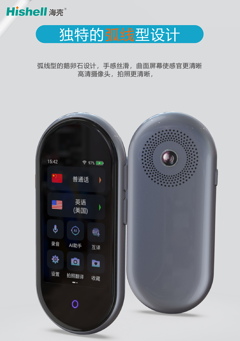 这款智能翻译机以弧线型鹅卵石为设计灵感,机身线条流畅温润,掌心握持手感丝滑细腻,带来舒适的握持体验。搭配高清曲面屏幕,显示清晰通透,操作界面直观易懂,视觉感官更出众。机身搭载高清摄像头,拍照翻译时成像锐利,文字捕捉更精准,有效提升翻译效率。无论是跨境交流、出国旅行还是外语学习,它都能凭借出色的外观设计与实用性能,成为你的贴心语言助手,轻松打破沟通壁垒。