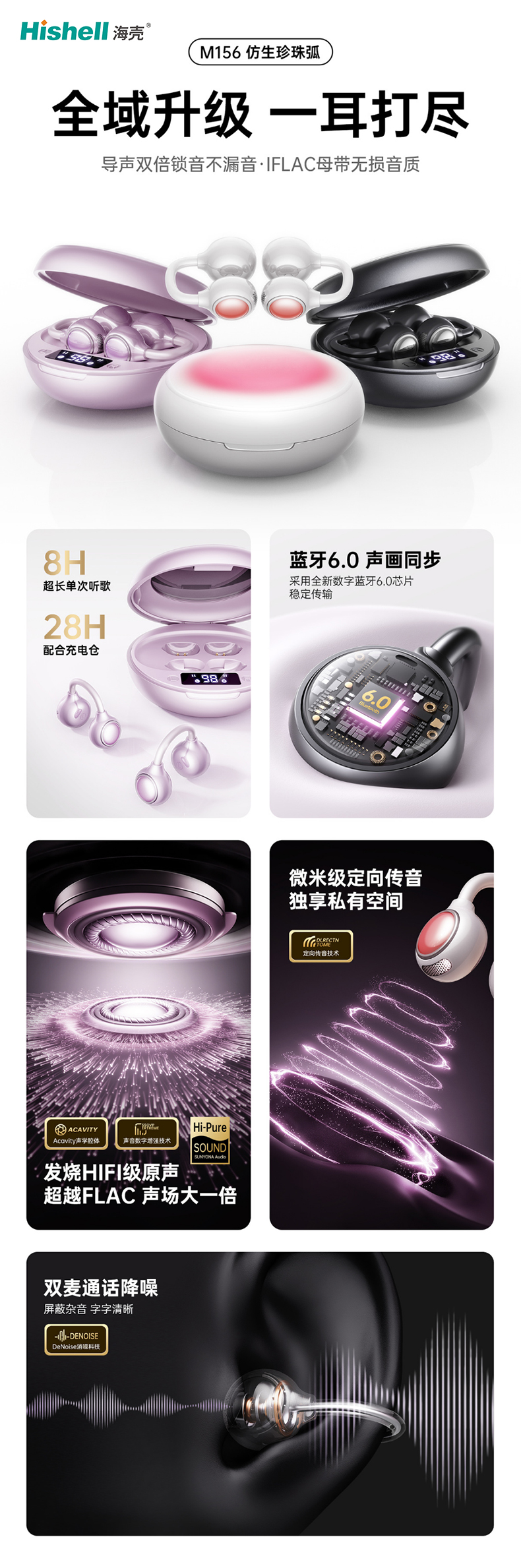 M156翻译耳机搭载仿生珍珠弧设计,全域升级带来更贴合耳道的佩戴体验,兼顾舒适与质感。音质上采用IFLAC母带无损解码技术,搭配发烧HIFI级原声配置,声场较普通FLAC格式扩大一倍,每一处声音细节都清晰还原,沉浸感拉满。