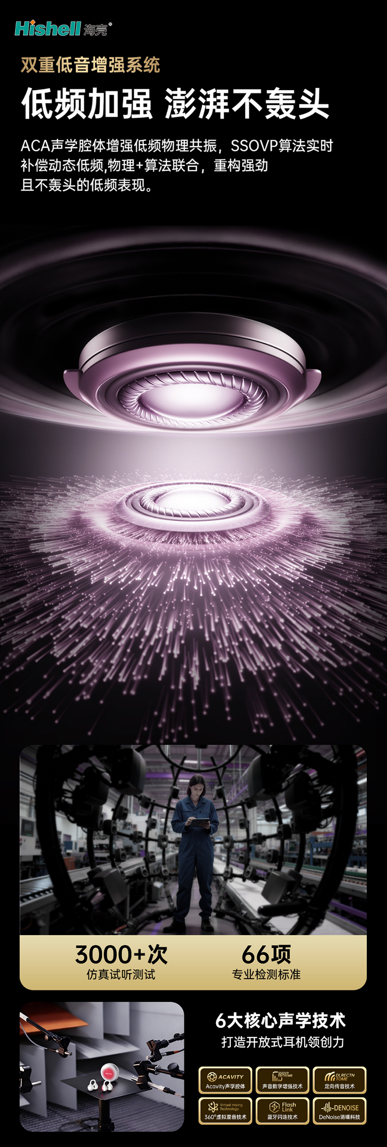 耳机采用ACA声学腔体设计,通过优化腔体结构增强低频物理共振,让低音更具层次感和穿透力,还原声音本真质感。配合SSOVP算法实时介入,动态补偿低频信号,精准调节音频曲线,避免低频过量导致的轰头问题。