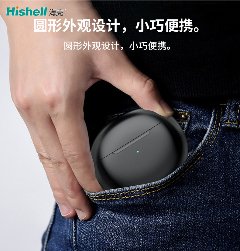 这款蓝牙耳机采用圆形外观设计,充电盒如鹅卵石般圆润可爱,盈盈一握,倍感舒心。整体身材轻巧,无论是放入口袋还是手包,都毫无负担,真正做到了小巧便携。