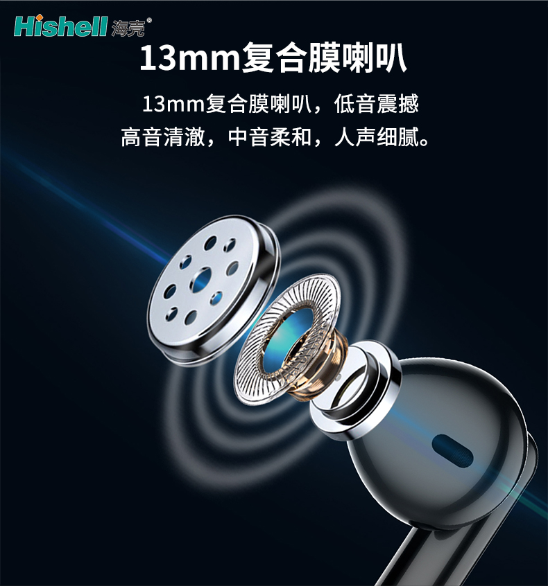 这款蓝牙耳机的核心亮点在于搭载13mm复合膜喇叭,凭借专业声学架构与精细调校,呈现越级音质表现。低音震撼有力,下潜深邃且富有弹性,鼓点节奏清晰可感;高音清澈通透,细节丰富不刺耳,乐器泛音细腻还原;中音温润柔和,人声演绎尤为细腻,仿佛歌手近在耳畔。