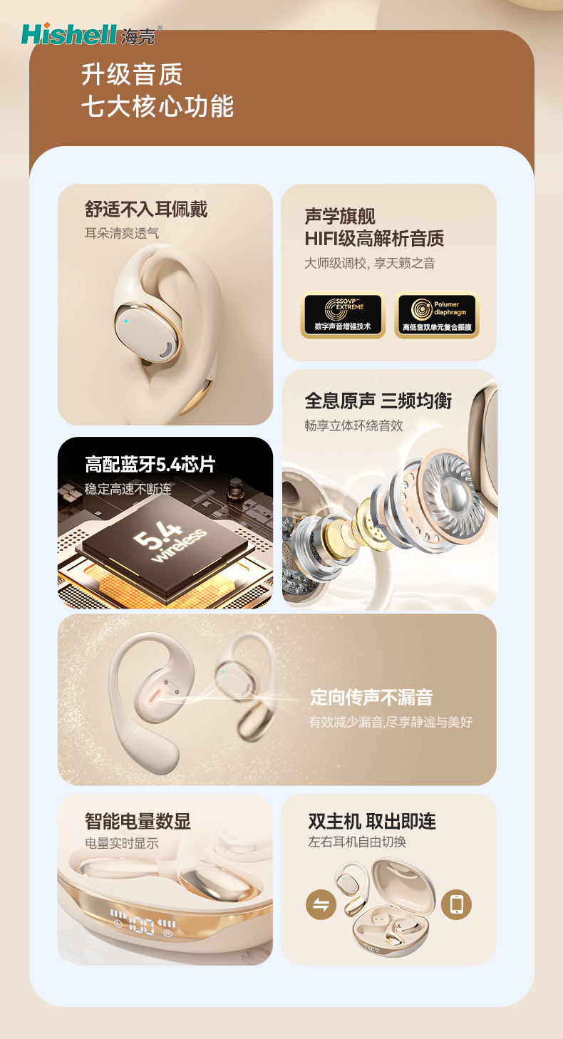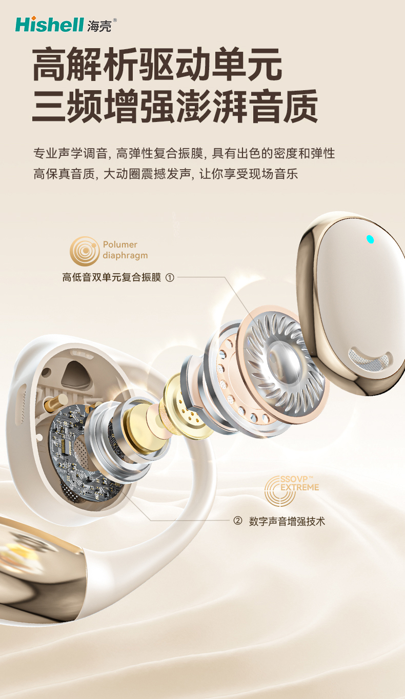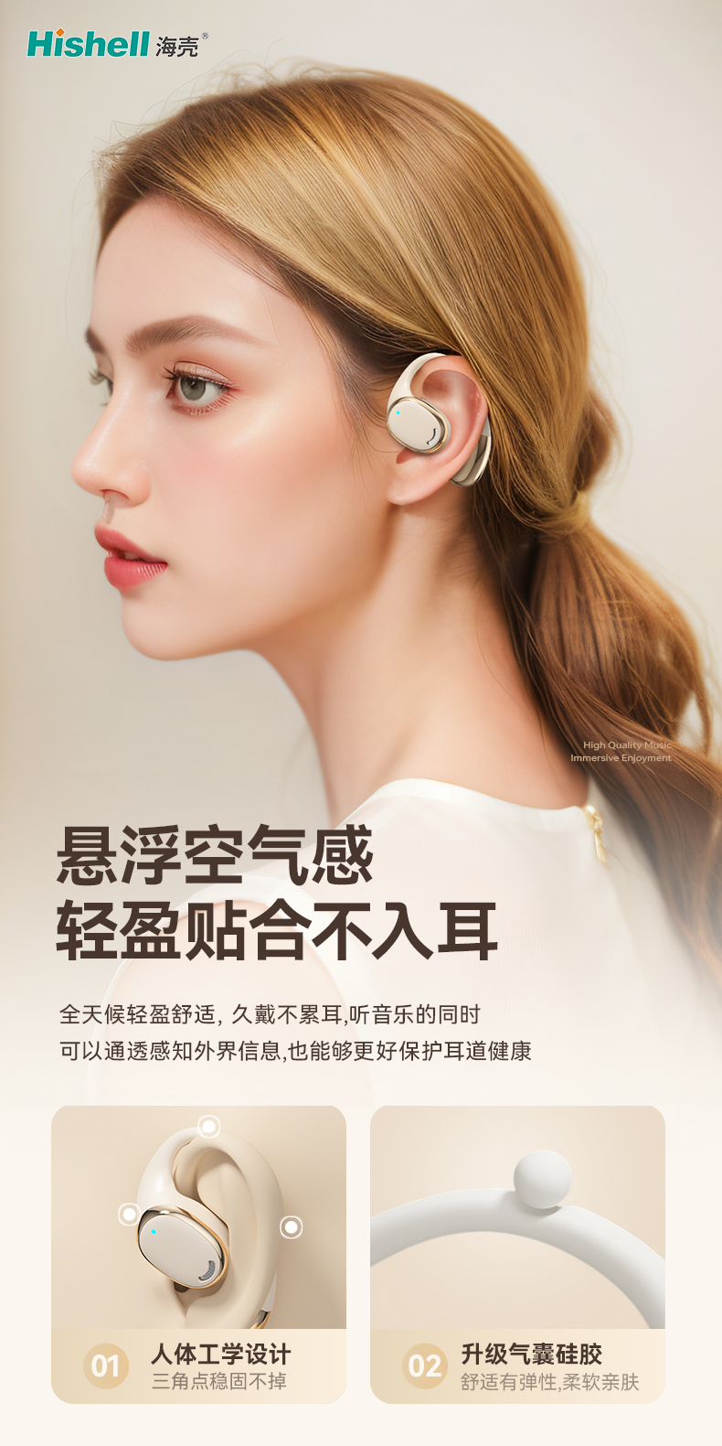 采用舒适不入耳佩戴设计,告别传统入耳式的闷热胀痛,耳朵时刻保持清爽透气,长时间使用也毫无负担。在声学表现上,它堪称声学旗舰,配备 HIFI 级高解析音质,经由大师级团队专业调校,每一个音符都清晰细腻,让你随时沉浸于天籁之音。