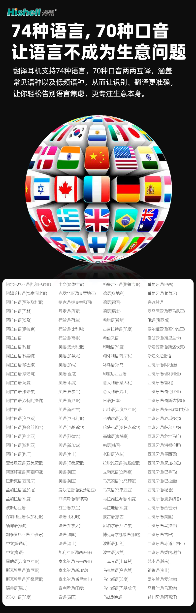 这款翻译耳机,以强大的语言覆盖能力成为你拓展全球生意的得力助手,让语言彻底不再是合作路上的绊脚石。它支持74 种语言、70 种口音两两互译,无论是英语、日语等常见语种,还是一些低频使用的小语种,都能轻松驾驭,真正做到 “无死角” 沟通。