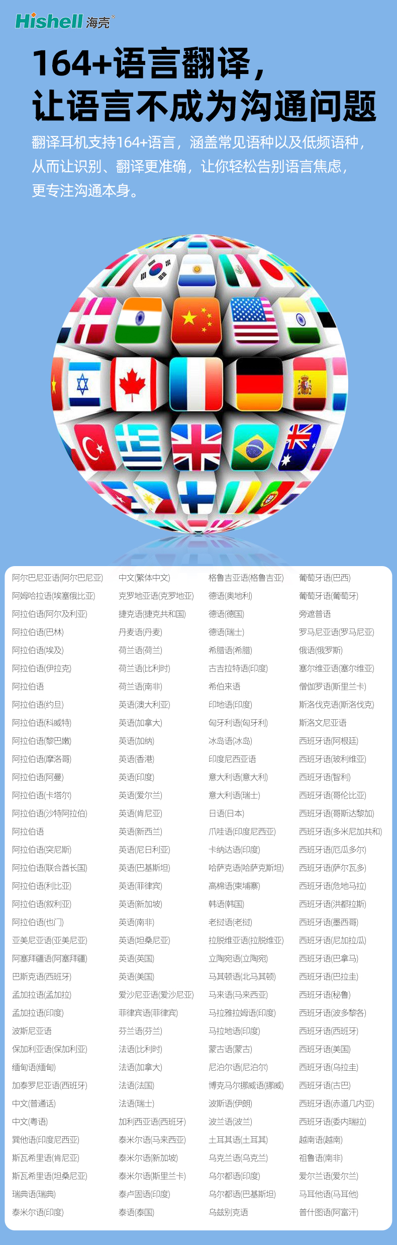 这款智能翻译耳机以164+种语言覆盖能力,打破跨语言沟通壁垒,让语言不再成为交流阻碍。它不仅囊括中、英、日、韩等主流常用语种,更精准覆盖各类低频小众语种,凭借强大的语料库支撑,实现高效识别与精准翻译,大幅降低沟通误差。