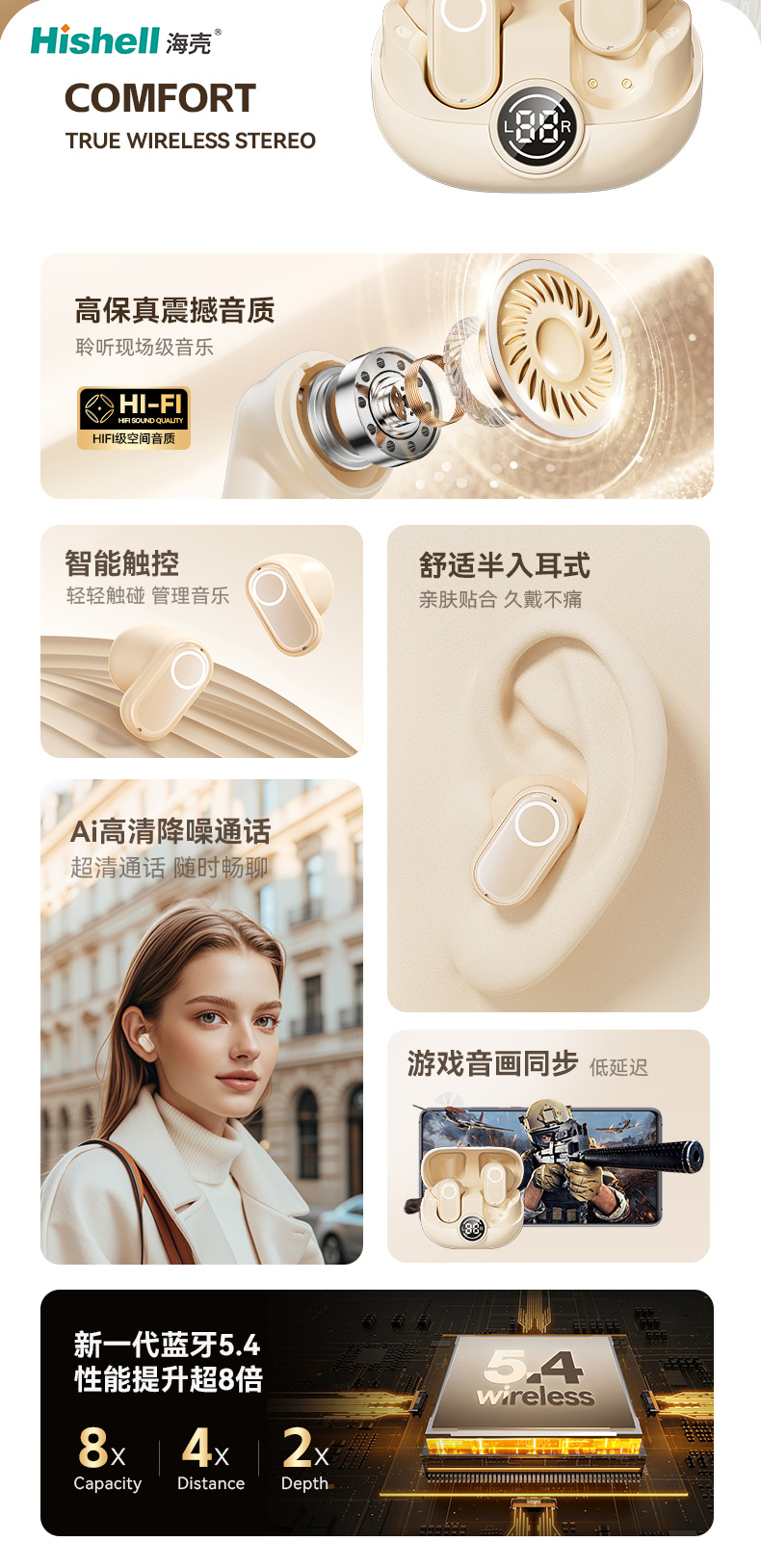 新一代蓝牙5.4芯片强势赋能,相较前代性能提升超8倍,连接更稳定、传输速率更快,有效杜绝断连烦恼,兼顾娱乐、办公与沟通的全场景需求,成为你的随身听觉伴侣。