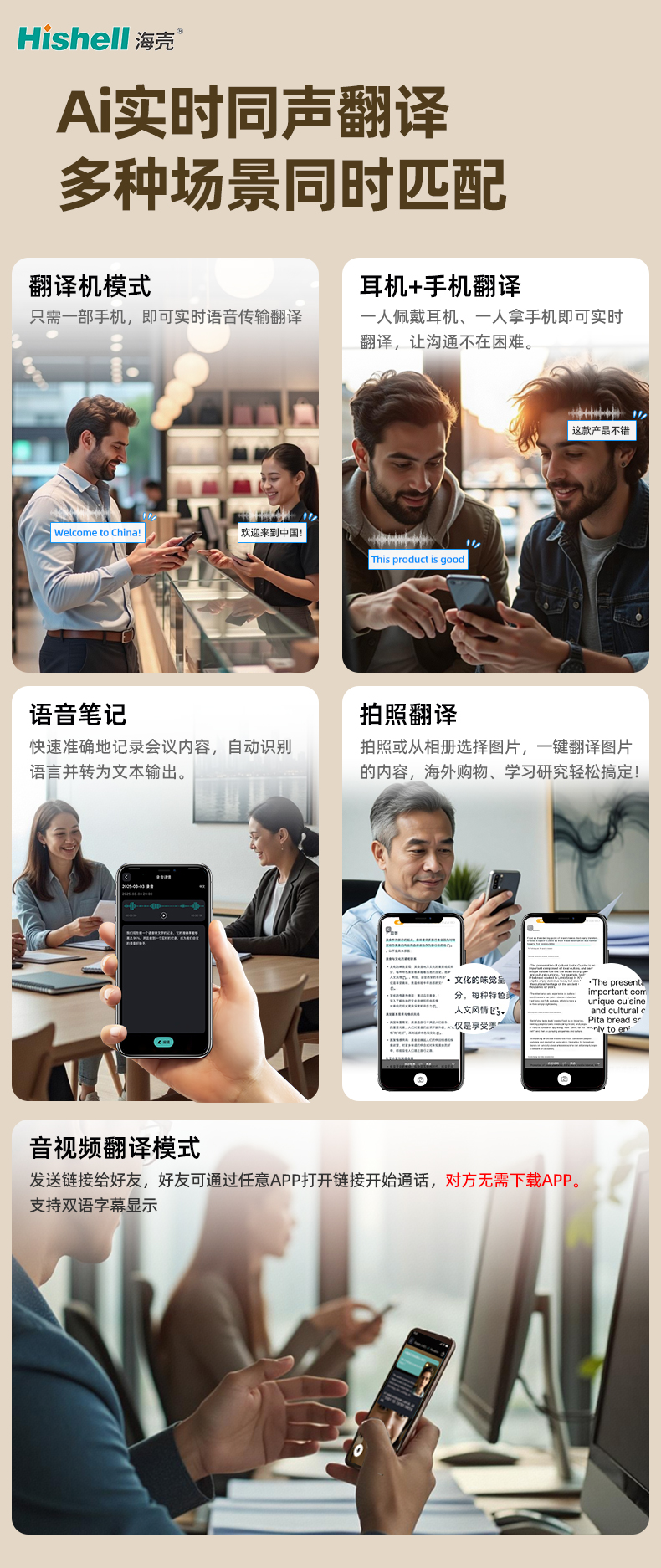 翻译机模式极简便捷,无需复杂设备,仅需一部手机即可实现实时语音传输翻译,开口即译,响应迅速。耳机+手机协作模式更显灵活,一人佩戴耳机、一人手持手机,便能完成双向实时翻译,无论是跨国会客还是境外交友,都能让沟通流畅无阻。