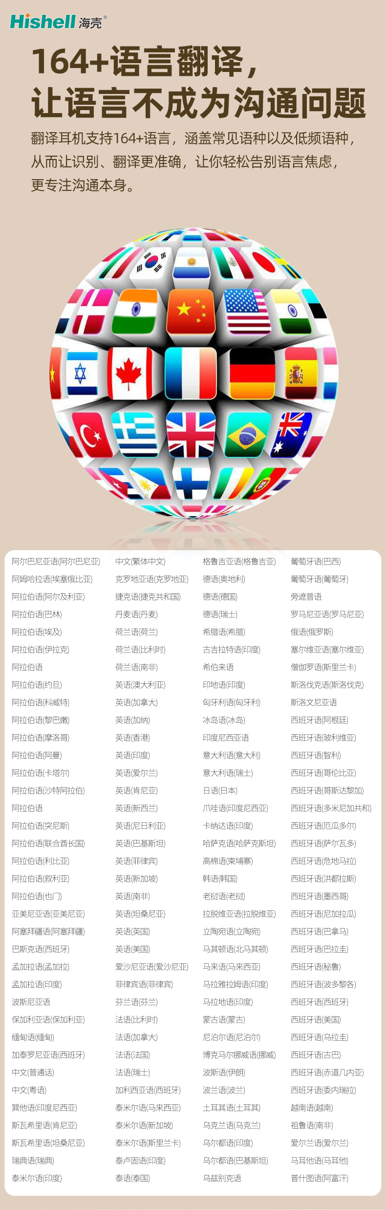 这款翻译耳机以164+种语言的强大翻译能力,重新定义跨语言沟通体验,让语言壁垒成为过去。它不仅全面覆盖英语、日语、法语等主流常见语种,更精准囊括各类低频小众语种,无论是商务洽谈中的专业术语,还是旅行途中的日常对话,都能实现毫秒级精准识别与翻译,还原最真实的沟通意图。