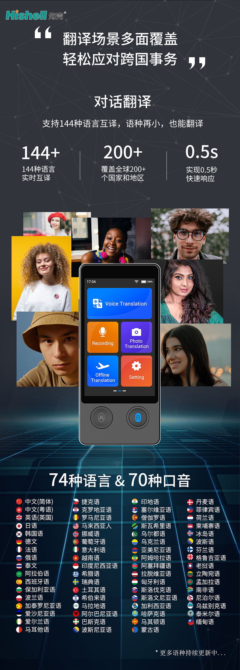 机身搭载144种语言互译功能,覆盖全球主要国家和地区,无论是商务洽谈、境外旅行还是日常交流,都能精准适配。支持离线翻译模式,无需网络也能流畅沟通,彻底解决境外网络不便的痛点;同时兼容WiFi与手机热点,联网状态下翻译速度更快、准确率更高。