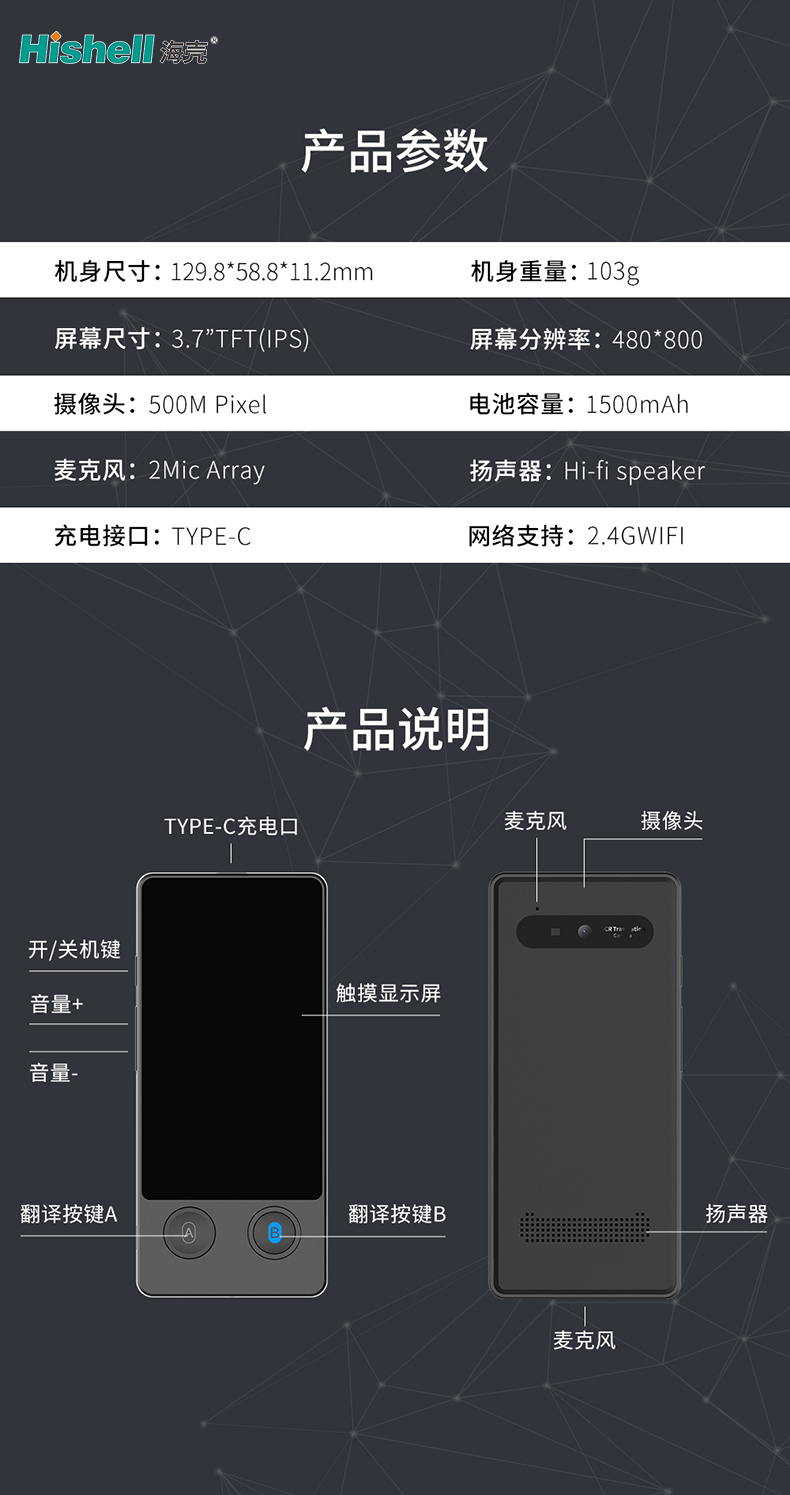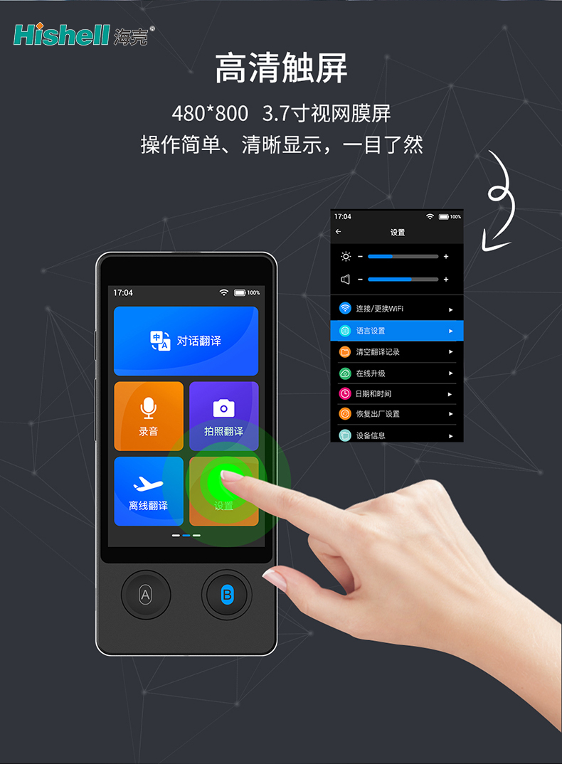 这款翻译机以高清触屏为核心亮点,搭配3.7寸视网膜屏,分辨率高达480*800,带来清晰细腻的视觉体验。屏幕显示通透鲜亮,文字、图标边缘锐利无模糊,无论是英文、中文还是其他语种的翻译结果,都能清晰呈现,哪怕是细小字体也一目了然,有效避免因显示不清导致的操作失误和翻译误解。
