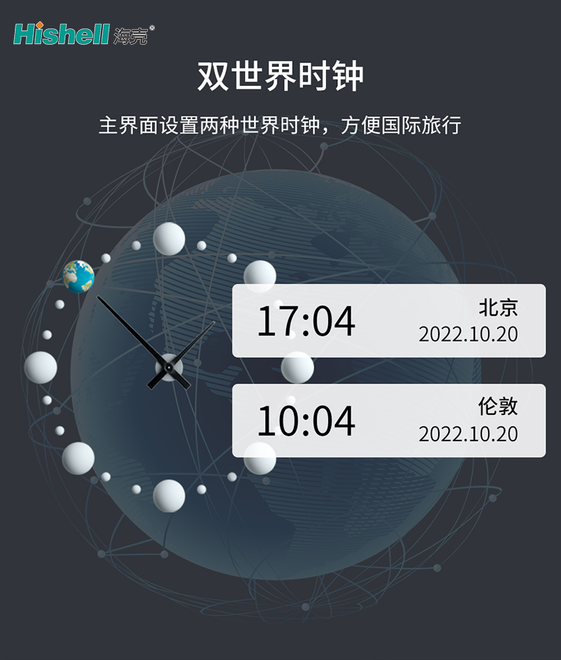 特别设置双世界时钟功能,主界面可同时显示两种不同时区的时间,方便国际旅行者随时掌握出发地与目的地时间,合理规划行程、协调作息,避免因时差带来的不便。小巧便携的机身搭配强大的实用功能,兼顾实用性与便捷性,为你的跨国出行保驾护航。