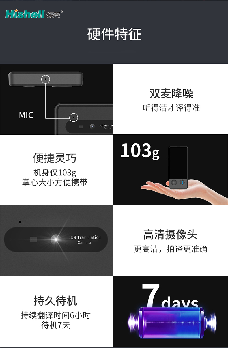 配备高清摄像头,拍译更清晰、识别更精准,遇到外文菜单、路标、文档时,轻轻一拍即可快速翻译,无需手动输入,省时又省力。续航表现出色,支持6小时持续翻译、7天待机,出门在外无需频繁充电,彻底解决续航焦虑,让跨语言沟通全程无忧。