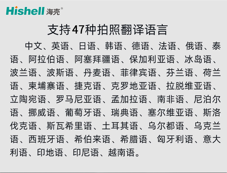 支持47种拍照翻译语言:中文、英语、日语、韩语、德语、法语、俄语、泰语、阿拉伯语、阿塞拜疆语、保加利亚语、冰岛语、波兰语、波斯语、丹麦语、菲律宾语、芬兰语、荷兰语、柬埔寨语、捷克语、克罗地亚语、拉脱维亚语、立陶宛语、罗马尼亚语、孟加拉语、南非语、尼泊尔语、挪威语、葡萄牙语、瑞典语、塞尔维亚语、斯洛伐克语、斯瓦希里语、土耳其语、乌尔都语、乌克兰语、西班牙语、希伯来语、希腊语、匈牙利语、意大利语、印地语、印尼语、越南语。