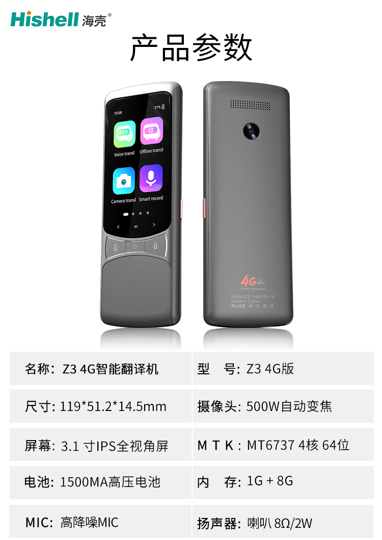 名称:Z3 4G智能翻译机 型号:Z3 4G版