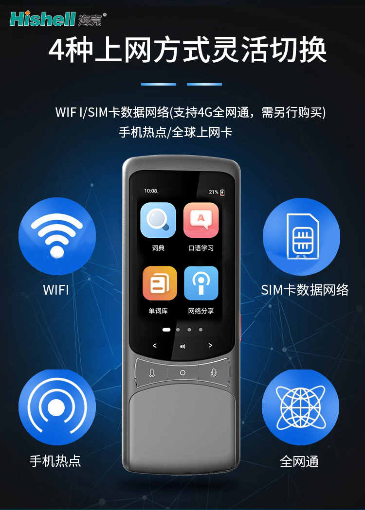 它能连接 WIFI,也可使用 SIM 卡数据网络(支持 4G 全网通,需另行购买),无论是酒店的稳定 WIFI,还是当地的 4G 网络,都能快速适配。若临时需要网络,手机热点、全球上网卡也能轻松连接,无需担心断联。不管是在异国街头导航问路,还是商务洽谈中的实时翻译,多种上网方式让翻译始终流畅,帮你轻松应对全球出行的沟通需求。