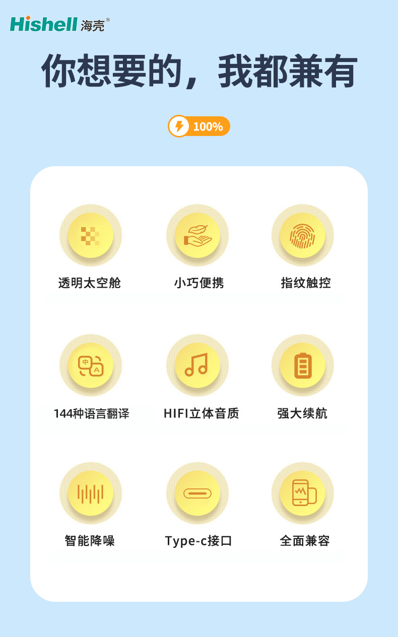 透明太空舱设计精致吸睛,机身小巧便携,轻松塞进口袋;搭配灵敏指纹触控,操作精准便捷。核心支持 144 种语言翻译,打破语言壁垒;HIFI 立体音质,翻译、听歌都清晰;强大续航告别电量焦虑,智能降噪让嘈杂环境也能顺畅沟通。Type-C 接口充电方便,还能全面兼容各类设备。不管是境外旅行、商务沟通,还是日常使用,它都能一站式满足需求,无需额外搭配其他设备,实用又省心。