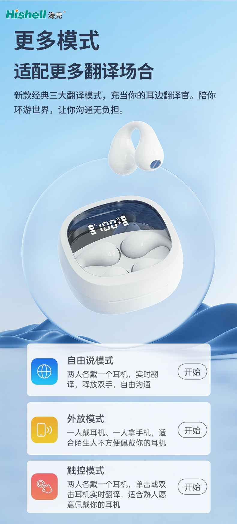 新款翻译耳机搭载经典三大翻译模式,能精准适配更多翻译场合,化身你的专属耳边翻译官,陪你环游世界,让跨语言沟通毫无负担。