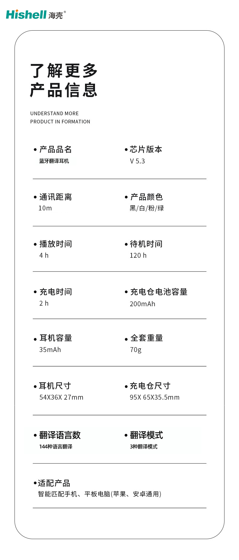 产品品名:蓝牙翻译耳机 芯片版本:V5.3