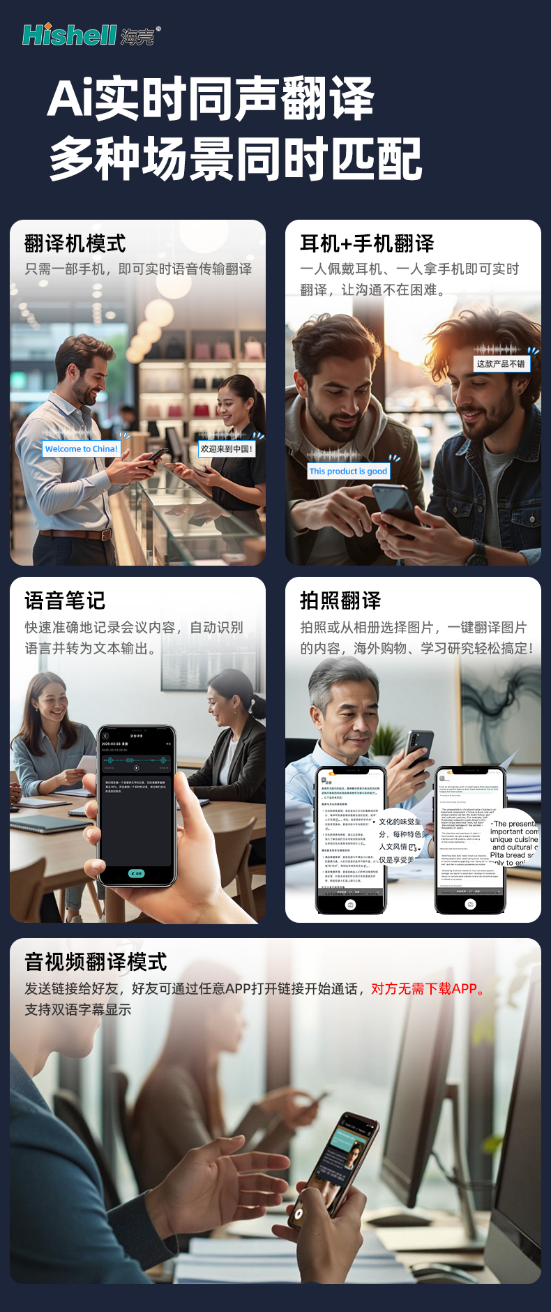 除核心翻译外,功能覆盖全场景需求:语音笔记功能高效助力职场,快速准确记录会议内容,自动识别多语种并转为文本输出,省去手动整理烦恼;拍照翻译功能解锁便捷体验,拍照或从相册选取图片,一键即可翻译内容,海外购物看懂商品说明、学习研究查阅外文资料都能轻松搞定;音视频翻译模式打破APP限制,发送链接给好友,对方无需下载专属APP,通过任意应用打开即可开启通话,更支持双语字幕同步显示,跨语言音视频沟通清晰无虞。