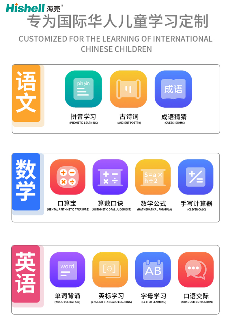 英语学习更是核心亮点,支持海量儿童高频单词背诵,搭配图文联想记忆与听写模式;内置标准音标教学课程,从发音口型到声调细节细致讲解,还有字母认知与书写指导;口语交际板块包含日常对话场景练习,搭配真人发音示范与纠音提示,帮助国际华人儿童突破语言环境限制,练就流利口语。整体机身设计贴合儿童抓握习惯,操作简单易懂,让学习随时随地高效开展。