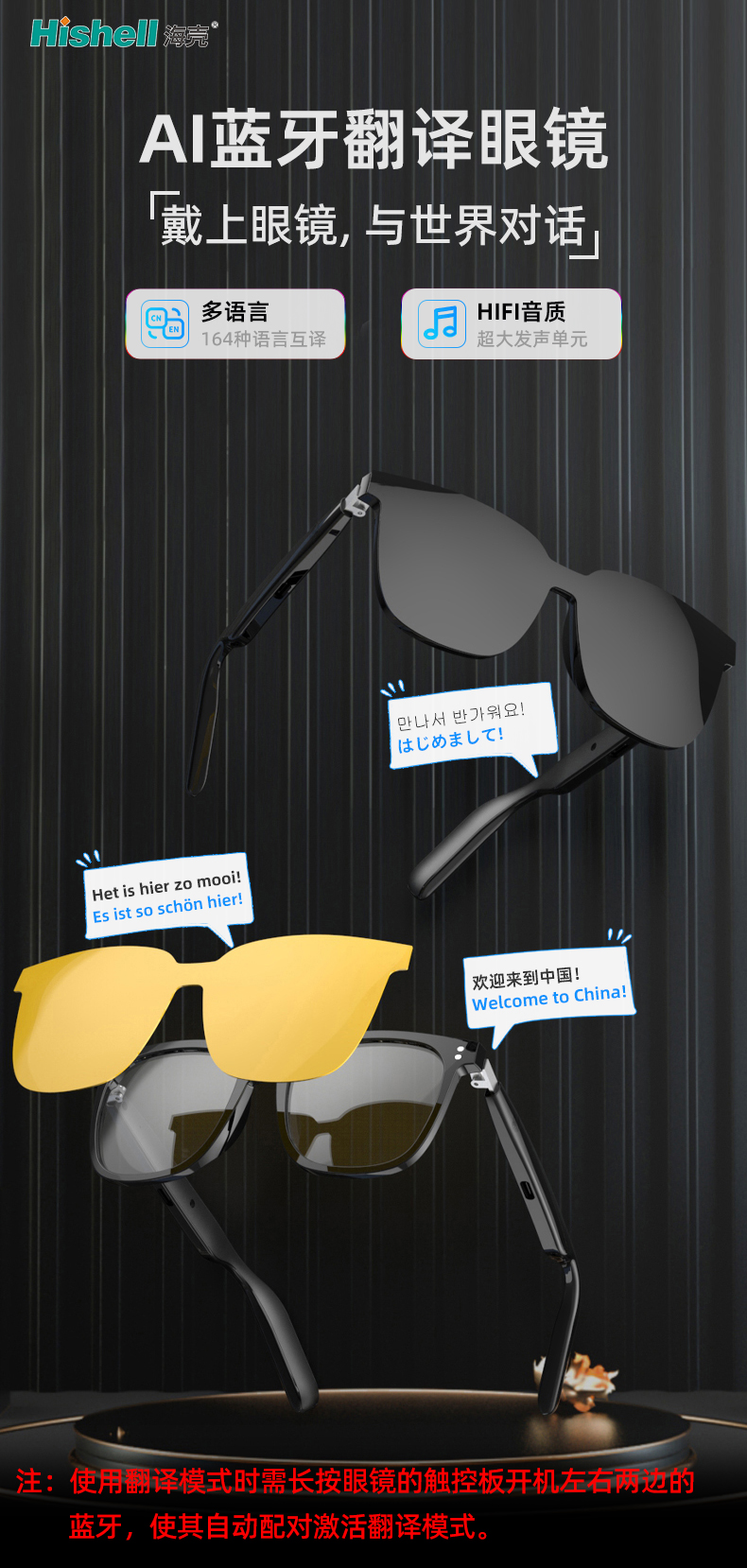 产品名称:智能蓝牙翻译眼镜 翻译语言数:144种语言互译