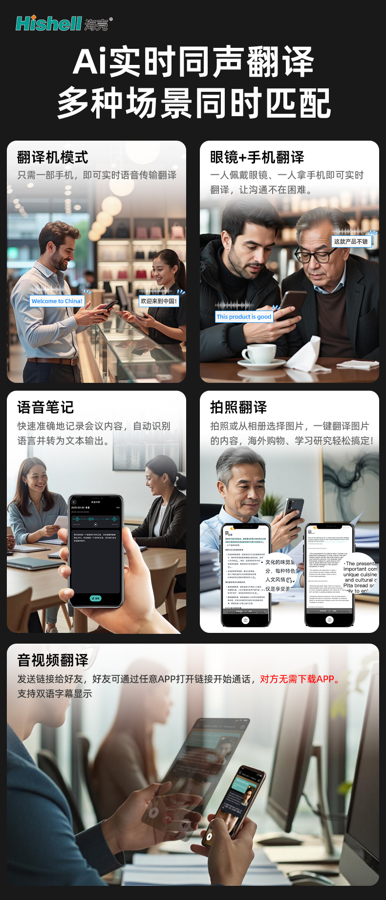 除核心翻译功能外,它还是高效助手:会议中开启语音笔记,能快速准确记录内容并自动识别语言转成文本;海外购物或学习研究时,拍照翻译帮你轻松搞定——拍照或从相册选图,一键就能翻译图片内容。音视频翻译更贴心,发送链接给好友,对方无需下载APP,用任意应用打开即可通话,全程支持双语字幕显示,跨国通话像面对面聊天一样简单。