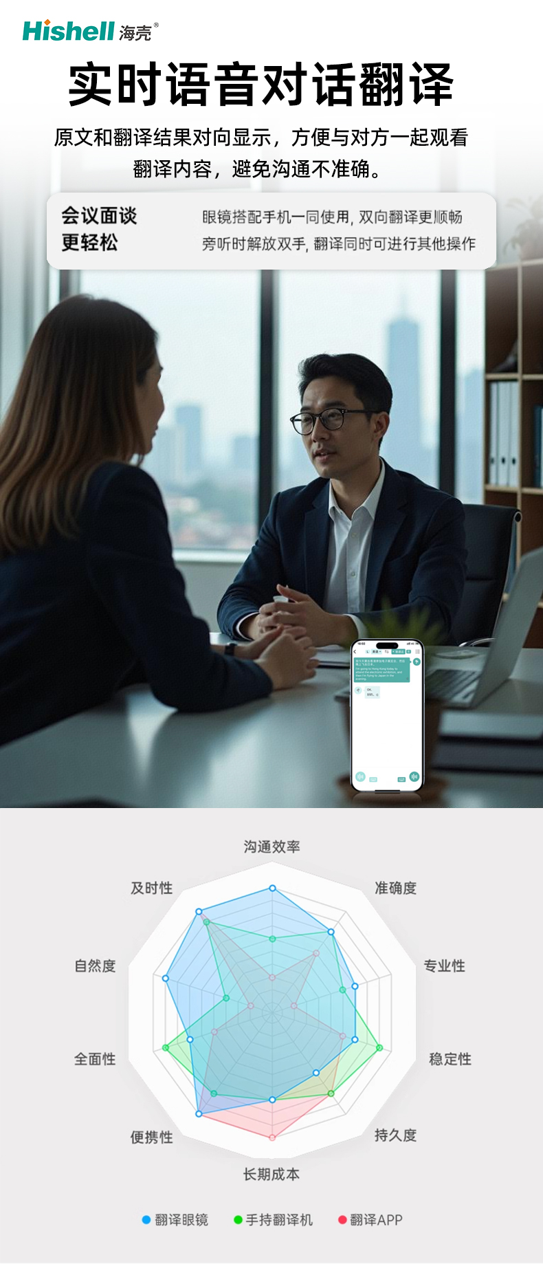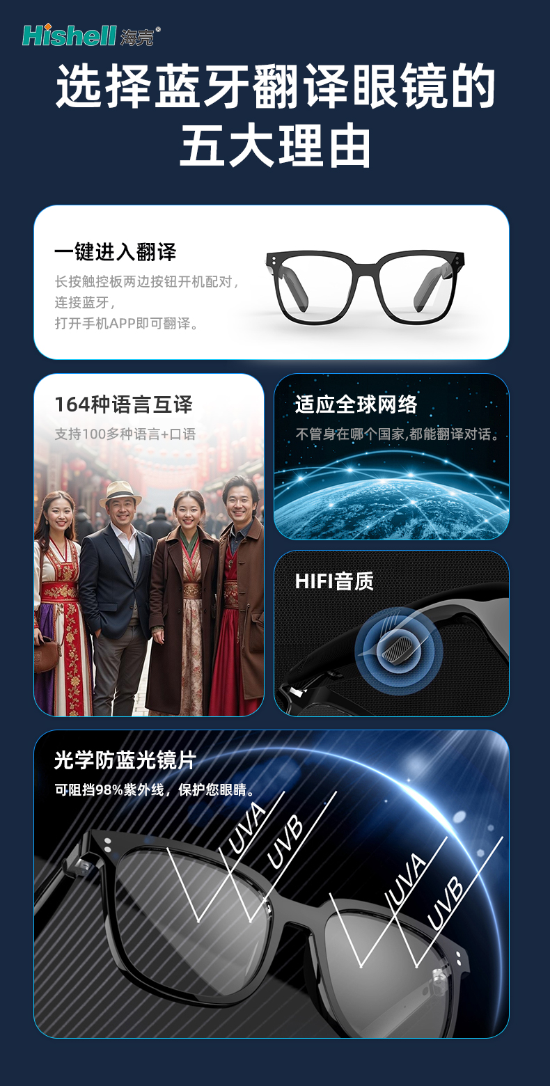 HIFI高清音质让你清晰捕捉每一处语音细节,光学防蓝光镜片更贴心,可阻挡98%紫外线,在助力沟通的同时,全方位守护你的双眼健康。