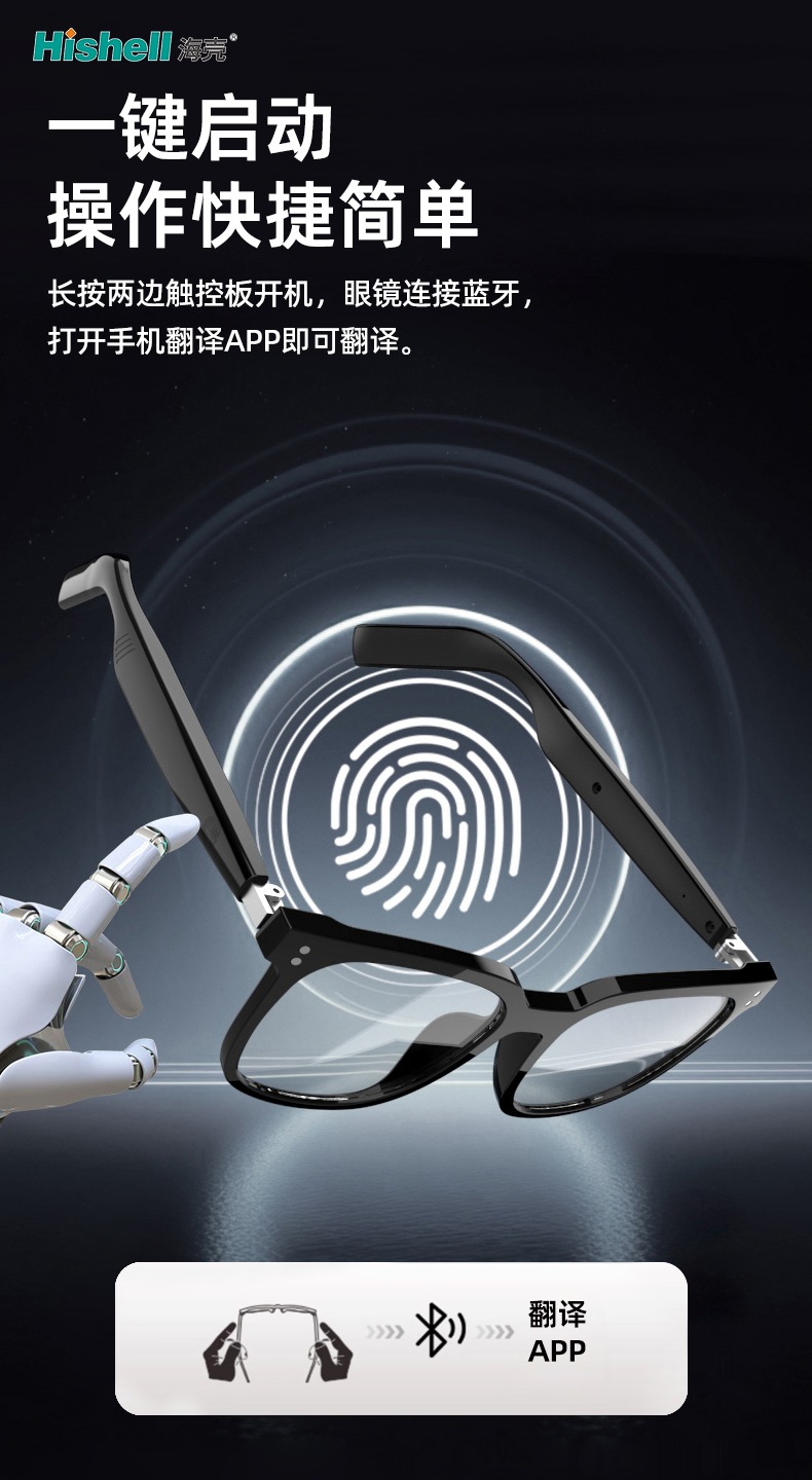 选择这款蓝牙翻译眼镜,五大核心优势让跨语言沟通零阻碍。操作极简,长按触控板两侧按钮开机配对,连接蓝牙并打开手机APP,一键即可启动翻译功能,无需复杂设置。