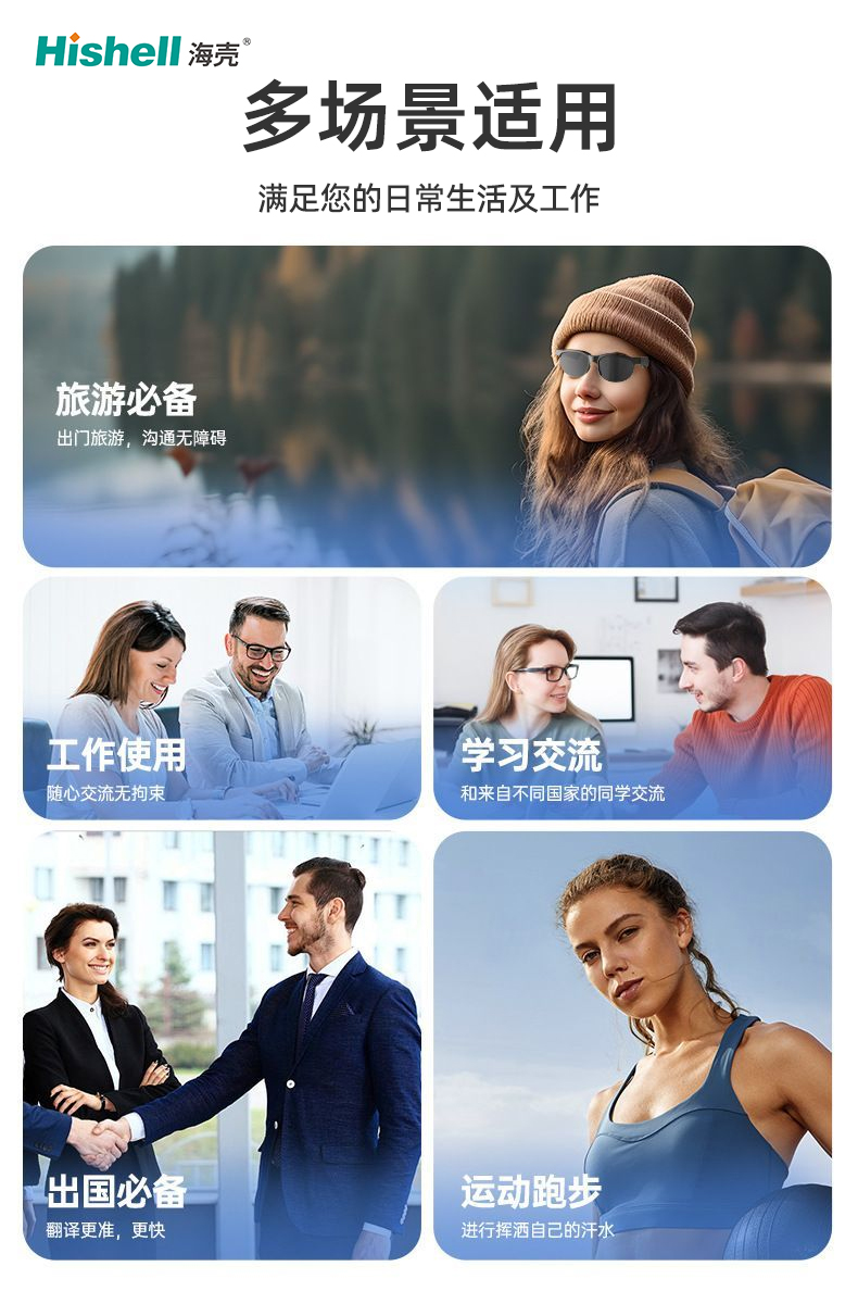 这款智能翻译眼镜堪称多面手,完美适配生活与工作的各类场景。出国旅游时戴上它,点餐问路全程无障碍,异国风情尽情体验;商务洽谈中,它实时精准翻译,让你与海外伙伴随心交流、畅聊无忧。和各国同学学习互动,它是高效桥梁,助力思想碰撞;出国出差更是必备,翻译速度与准确度双在线。即便运动跑步挥洒汗水,轻便设计也能稳固贴合,让你在享受运动的同时,随时应对突发沟通需求,跨语言障碍从此轻松打破。
