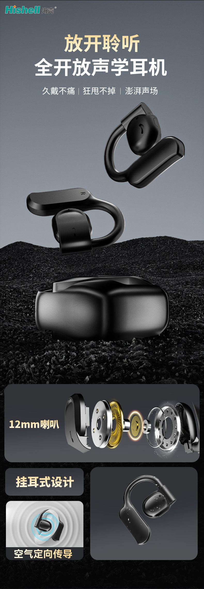 这款全开放声学蓝牙耳机,解锁“放开聆听”的全新体验。采用挂耳式设计搭配亲肤硅胶材质,贴合耳廓却无压迫感,实现久戴不痛的舒适享受,记忆合金骨架加持,运动时狂甩不掉。核心搭载12mm大尺寸喇叭与空气定向传导技术,精准聚焦声音传输,减少漏音的同时打造澎湃声场,低音饱满、中高频通透。无需堵塞耳道,既能沉浸音乐,又能感知环境音,通勤、运动、办公多场景适配。轻量化机身搭配稳定蓝牙连接,让每一次聆听都自在随心,兼顾舒适、稳固与音质质感。