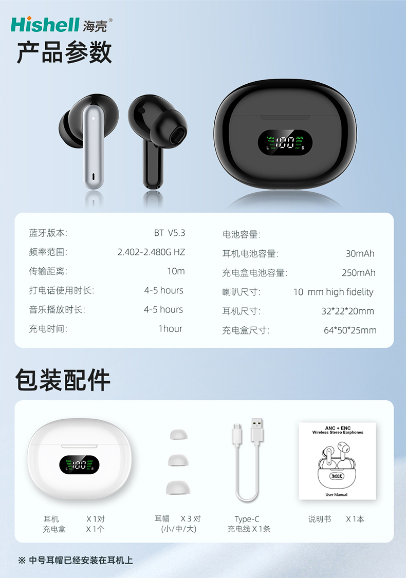 包装配件:耳机*1对,耳帽*3对,充电盒*1,type-c*1条,说明书*1本