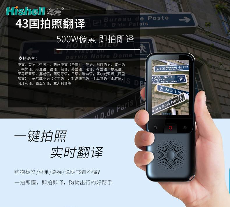 它搭载 500W 像素镜头,支持一键拍照、实时翻译,不管是印刷清晰的商品标签、餐厅菜单,还是街头的路标指示、复杂的产品说明书,只需对准一拍,就能即刻获取准确翻译,真正实现 “一拍即懂,即拍即译”。不用再靠手势比划,也不用费力查词典,有它在,购物时能精准选品,出行时能顺畅找路,让你的异国购物与出行都更省心,妥妥的实用好帮手。