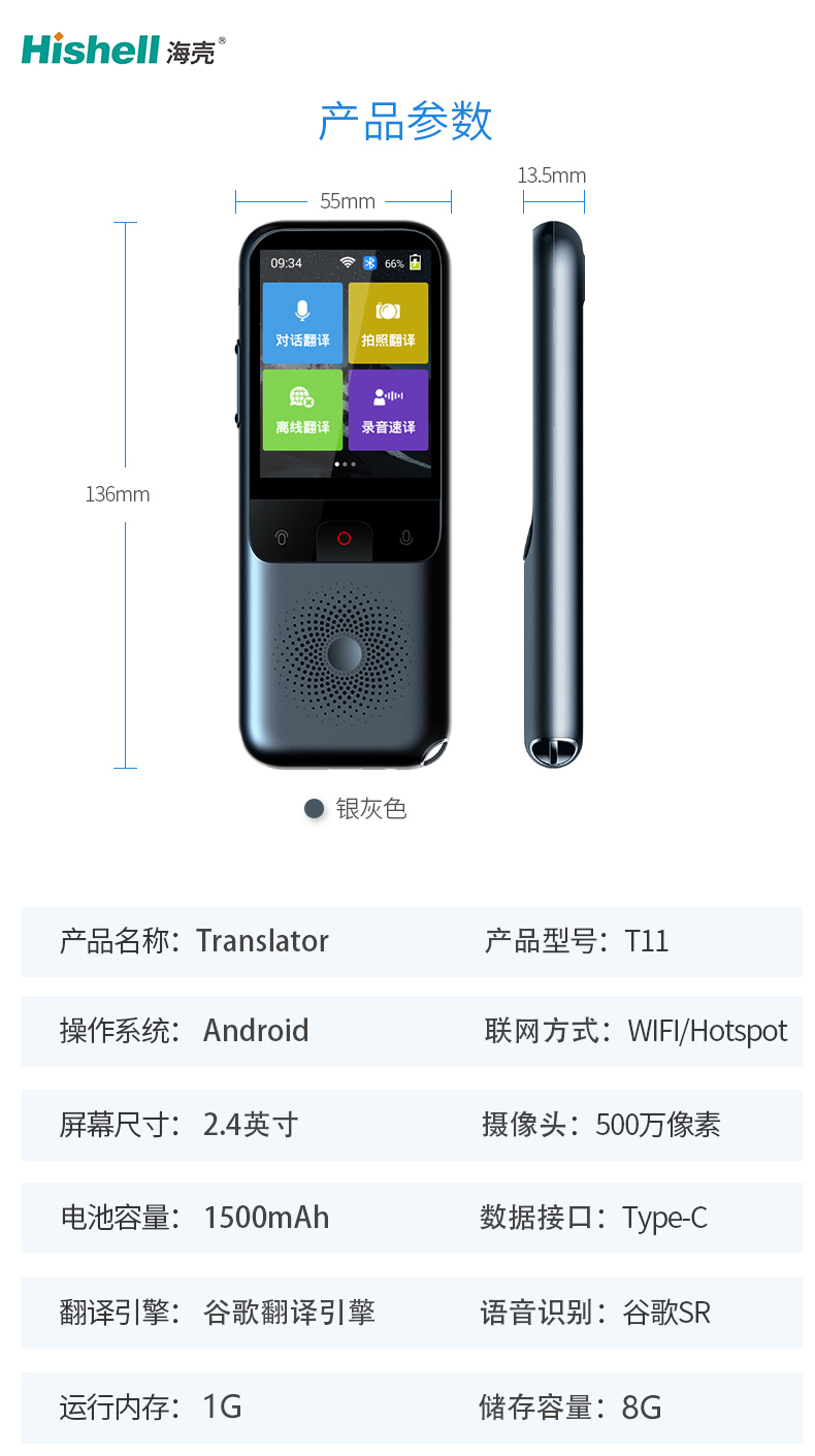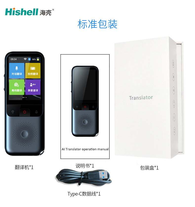 标配清单:翻译机*1,说明书*1,包装盒*1,Type-C数据线*1