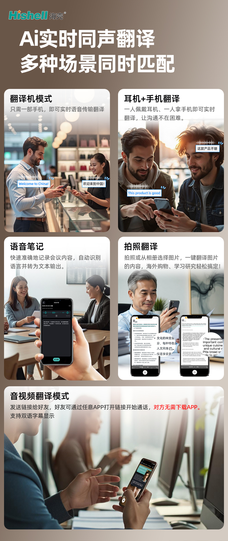 这款AI实时同声翻译耳机,以强大智能内核适配多元场景,让跨语言沟通告别阻碍。翻译机模式极为便捷,仅需一部手机,就能实现实时语音传输与翻译,无需复杂设备搭配。若需双人对话,一人佩戴耳机、一人手持手机,语音即可同步转换,让交流流畅自然。