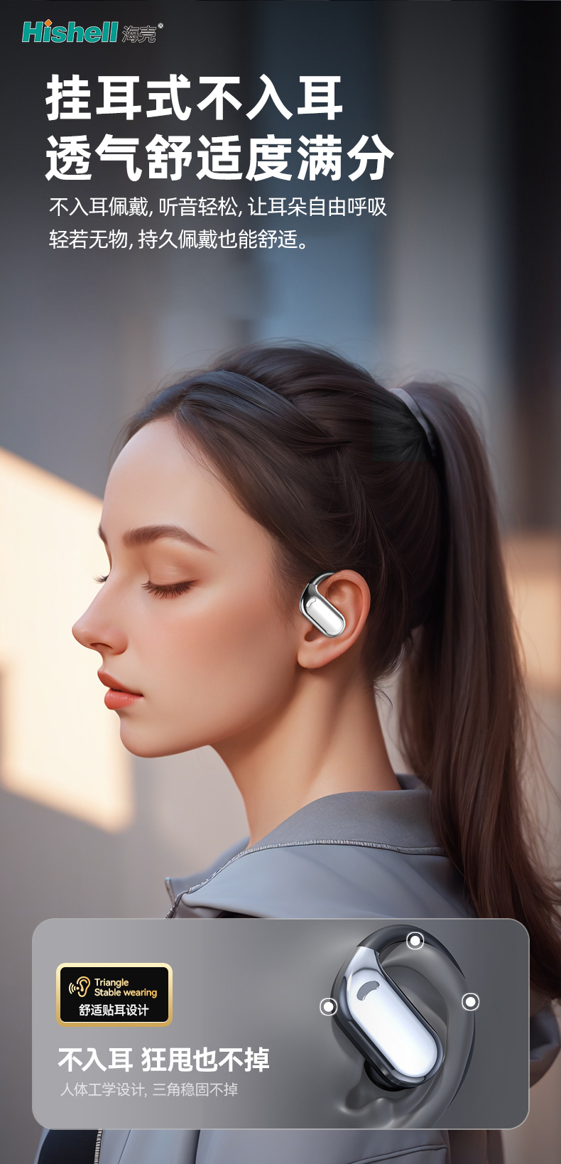 它摒弃传统入耳式的压迫感,采用挂耳结构搭配不入耳佩戴方式 —— 耳机轻盈挂在耳廓上,发声单元不深入耳道,仅贴合外耳轮廓,既能清晰传递翻译语音与外界声音,又能让耳道保持通透,实现 “耳朵自由呼吸”。整体机身轻量化设计,佩戴时轻若无物,即便长时间使用,无论是商务洽谈时连续几小时通话翻译,还是海外旅行中全天沟通,耳部都不会有闷热、胀痛感,持久佩戴依旧舒适。