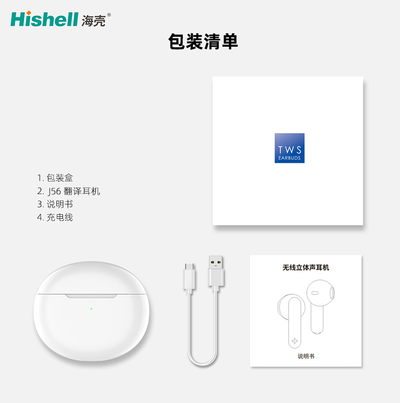 包装清单:包装盒*1,J56翻译耳机*1,说明书*1,充电线*1